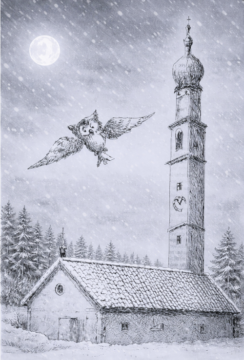 Sul bordo di un lucernaio del campanile, la civetta Giusi osservava ogni notte, con tranquilla regolarità, le monotone passeggiate delle lancette. Quella sera non era uscita in cerca di qualche topolino ancora vagante nella fredda notte invernale: aveva preferito restare lì, sola sul campanile, invece di accompagnare le sorelle a caccia sopra i tetti. Mentre apriva e chiudeva i suoi luccicanti occhietti, come solo le civette sanno fare, notò che l’orologio aveva davvero qualche problema. Si spinse allora fuori dal lucernario e, dopo pochi battiti d’ali, si posò su un ferro vicino al quadrante. Appollaiata su quel ferro — un tempo usato dagli abitanti di Cesio come meridiana — Giusi poteva ammirare le luci degli alberi di Natale che, senza obbedire ad alcuna legge, si spegnevano e si accendevano.